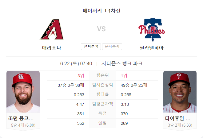 필리스는 홈 경기에서 꾸준히 좋은 성적을 유지하고 있으며, 타선도 안정적인 득점을 기록하고 있습니다. 애리조나 다이아몬드백스는 최근 원정 경기에서 불안한 모습을 보여 이번 경기에서도 어려움을 겪을 것으로 보입니다.