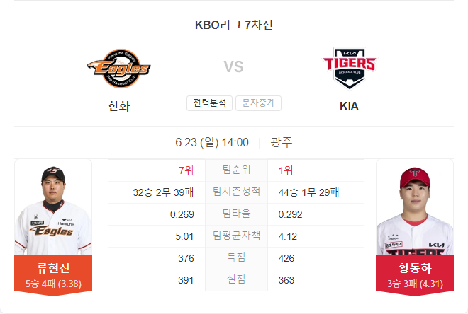 기아 타이거즈는 리그에서 강력한 공격력을 자랑하는 팀입니다. 그러나 이번 경기에서는 한화의 에이스 류현진을 상대로 어려운 경기를 펼칠 것으로 예상됩니다. 기아는 공격적인 플레이를 통해 류현진의 견고한 투구를 공략해야 하는 상황입니다.
