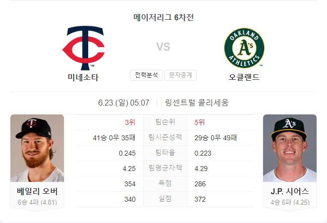 이번 경기는 미네소타 트윈스가 우세할 것으로 예상됩니다. 트윈스는 강력한 타선과 안정적인 투구력을 바탕으로 경기의 주도권을 잡을 가능성이 큽니다. 베일리 오버는 이번 시즌 동안 안정적인 투구를 보여주고 있으며, 오클랜드의 저조한 타선을 상대로 강력한 모습을 보일 것으로 기대됩니다.