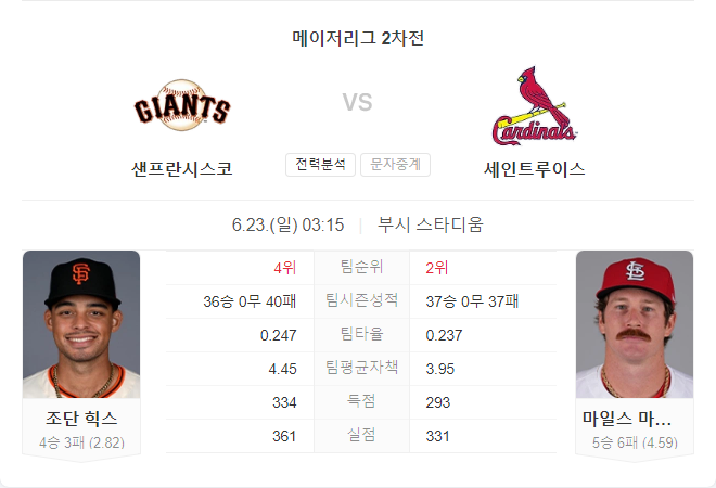 이번 경기는 세인트루이스 카디널스가 유리할 것으로 보입니다. 샌프란시스코 자이언츠는 최근 3연패로 부진한 모습을 보이고 있으며, 조던 힉스는 최근 등판에서 다소 불안한 모습을 보였습니다. 반면, 세인트루이스 카디널스는 최근 경기에서 연패를 끊고 승리를 거두며, 마일스 미콜라스의 안정적인 투구가 기대되는 상황입니다.