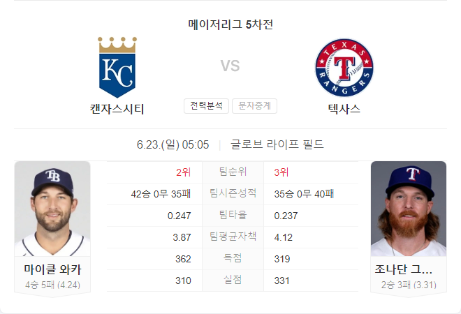이번 경기는 텍사스 레인저스가 우세할 것으로 보입니다. 캔자스시티 로열스의 마이클 와카가 부상 복귀 후 첫 경기를 치르면서 텍사스 타선의 강력한 공격을 막아낼 수 있을지 의문입니다. 반면, 텍사스 레인저스의 맥스 슈어저는 시즌 첫 출전으로 강력한 투구를 보여줄 가능성이 큽니다.