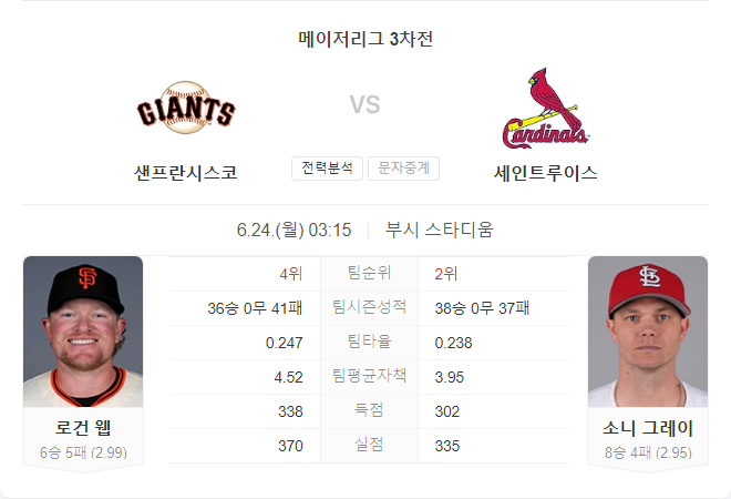 6월 24일 MLB 샌프란시스코 자이언츠 VS 세인트루이스 카디널스 타카짱의 경기 예측 분석