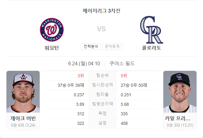 워싱턴의 선발 투수 제이크 어빈은 최근 4경기에서 24이닝 동안 3실점만 허용하며 안정적인 피칭을 보여주고 있어 기대를 모으고 있습니다. 반면 콜로라도의 카일 프리랜드는 이번 시즌 부상으로 인해 긴 공백기를 가졌으며, 복귀 후 첫 경기에 대한 불안 요소가 큽니다. 그의 최근 성적 또한 좋지 않기 때문에 워싱턴이 우세할 것으로 예상됩니다.
