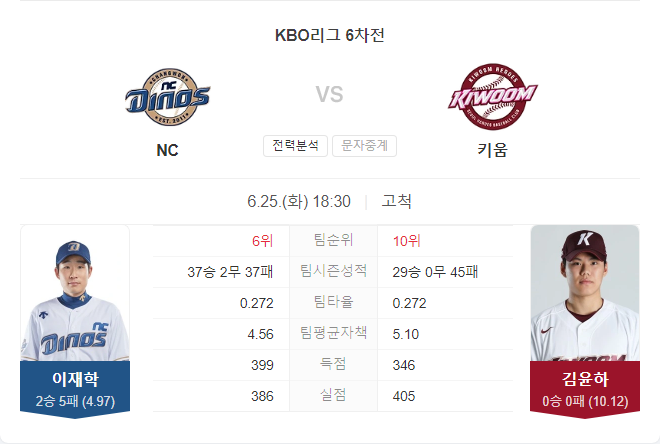 양 팀 타선 모두 다소 아쉬운 타격감을 선보이고 있지만, 올 시즌 키움에 강한 NC 다이노스가 전반적으로 준수한 피칭을 선보이는 선발 투수 이재학을 앞세워 또다시 승리를 가져갈 것으로 전망됩니다.