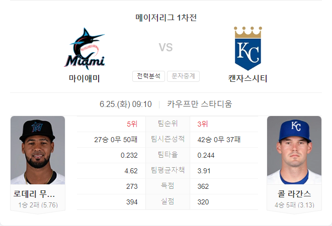 6월 25일 MLB 마이애미 말린스 VS 캔자스시티 로열스 타카짱의 경기 예측 분석