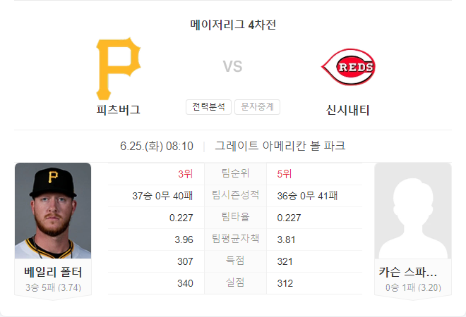 이날 경기 선발 투수는 베일리 폴터입니다. 폴터는 최근 신시내티전에서 7이닝 2실점으로 호투했지만 팀 타선의 지원을 받지 못해 패배를 기록했습니다. 올 시즌 3승 5패, 평균자책점 3.74를 기록 중인 폴터는 최근 5경기 중 4경기에서 3실점 이하로 안정적인 투구를 보여주고 있습니다. 그의 투구는 피츠버그의 마운드에서 중요한 역할을 할 것입니다. 폴터의 꾸준한 성적은 이번 경기에서 피츠버그의 승리 가능성을 높이는 중요한 요소로 작용할 것입니다.