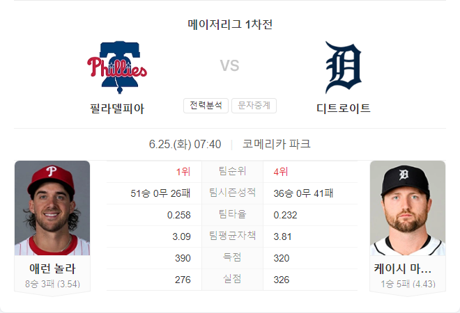 반면 디트로이트 타이거즈는 최근 부진한 모습을 보이고 있으며, 선발 투수 마이즈의 성적도 불안정한 편입니다. 특히 야간 경기에서 마이즈의 평균자책점이 5.94로 높아지는 점도 필리스에게 유리하게 작용할 것으로 보입니다. 타이거즈는 이번 경기에서 강력한 필리스의 타선을 막아내기 어려울 것으로 예상됩니다.