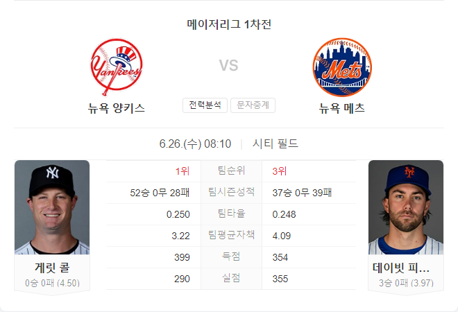 뉴욕 양키스는 최근 경기에서 다소 부진한 모습을 보이고 있으나, 게릿 콜의 복귀와 함께 투수진의 안정성을 기대할 수 있습니다. 반면, 뉴욕 메츠는 최근 상승세를 타고 있으며, 데이비드 피터슨의 안정적인 투구가 기대됩니다. 메츠는 홈 경기에서의 이점을 살려 양키스를 상대로 승리할 가능성이 높습니다.