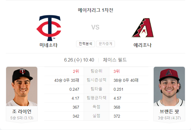 반면, 애리조나 다이아몬드백스는 브랜든 파아드의 불안한 투구가 경기 결과에 영향을 미칠 수 있습니다. 트윈스의 강력한 타선과 라이언의 안정된 투구를 고려할 때, 트윈스가 우세할 것으로 예상됩니다.