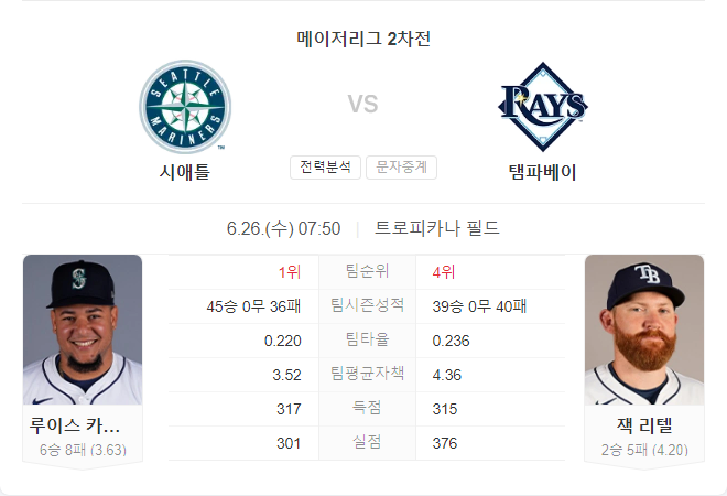 시애틀 매리너스는 최근 원정 경기에서 부진한 모습을 보이며, 루이스 카스티요의 불안한 투구도 우려되는 부분입니다. 반면, 탬파베이 레이스는 최근 경기에서 상승세를 타고 있으며, 잭 리텔의 안정적인 투구가 팀의 승리에 기여할 가능성이 높습니다. 탬파베이의 공격력도 강화된 모습을 보이고 있어, 이번 경기에서 유리한 위치에 있을 것으로 예상됩니다.