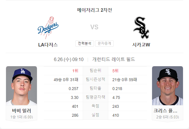 반면 화이트삭스는 타선이 약하고 플렉센이 다저스 타선을 막아내기 어려울 것으로 보입니다. 다저스가 이번 경기를 다득점으로 가져갈 가능성이 큽니다.