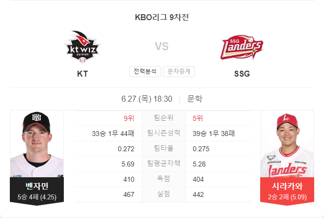 KT 위즈의 승리를 예상합니다. KT는 안정적인 선발 투수 벤자민의 투구와 함께 최근 원정 경기에서 좋은 성적을 이어가고 있습니다. 반면 SSG 랜더스는 수비에서의 약점이 두드러지며 어려움을 겪고 있습니다. 이러한 요소들을 종합적으로 고려할 때, KT 위즈가 SSG 랜더스를 상대로 승리를 거둘 가능성이 높습니다.