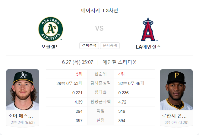 반면, 에인절스는 불펜 투수들을 활용해야 하는 상황이지만, 오클랜드의 약한 공격력을 감안할 때 충분히 경기의 주도권을 잡을 수 있을 것으로 보입니다.