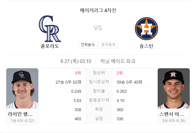 6월 27일 MLB 콜로라도 로키스 VS 휴스턴 애스트로스 타카짱의 경기 예측 분석