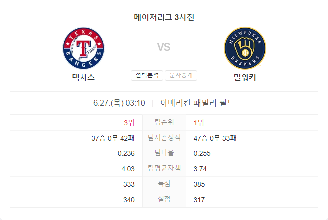 텍사스 레인저스는 나단 이오발디의 좋은 투구에도 불구하고 원정 경기에서의 부진을 극복하기 어려울 것입니다. 또한, 레인저스의 타선이 꾸준하지 못한 반면, 브루어스는 전반적으로 균형 잡힌 공격력을 가지고 있어 유리한 상황입니다.