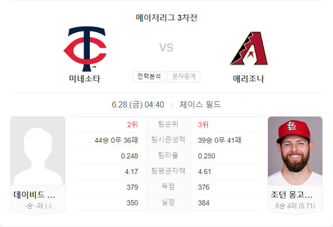 | 6월 27일 MLB 미네소타 트윈스 VS 애리조나 다이아몬드백스 타카짱의 경기 예측 분석 (0) | 2024.06.27 |