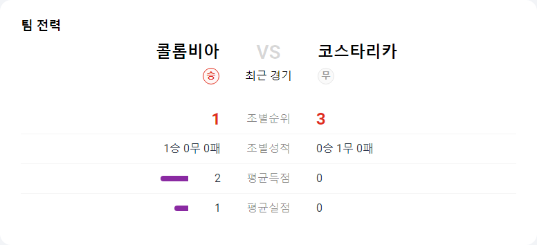 콜롬비아는 코스타리카와의 역대 전적에서 100% 승률을 기록하고 있으며, 이번 경기에서도 유리한 위치에 있습니다. 콜롬비아는 최근 4경기 연속 전반전에 최소 1골 이상을 기록했으며, 이는 이번 경기에서도 유지될 가능성이 큽니다. 반면, 코스타리카는 최근 2번의 원정 경기에서 득점에 어려움을 겪고 있습니다.