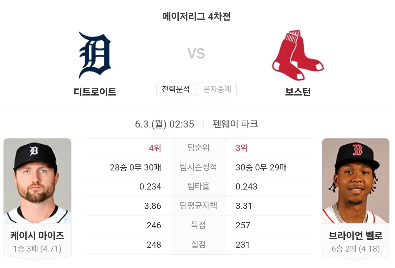 디트로이트 타이거즈의 케이시 마이즈는 최근 부진한 모습을 보였지만, 보스턴 레드삭스의 브라얀 벨로는 안정적인 투구를 이어가고 있습니다. 보스턴은 홈에서 강한 모습을 보이며, 최근 일요일 경기에서 무패 기록을 유지하고 있습니다.