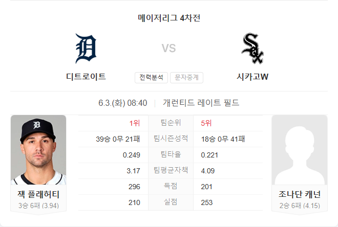 디트로이트는 마운드와 중심 타선 모두에서 확고한 우위를 보이고 있으며, 플래허티의 안정감 있는 피칭은 화이트삭스 타선을 제압하기에 충분합니다. 반면 화이트삭스는 조너선 캐넌의 흔들리는 제구와 낮은 타선 집중력이 발목을 잡고 있어, 전체적인 전력 차가 뚜렷하게 드러나는 매치업입니다. 디트로이트가 초반부터 리드를 잡고 경기를 주도할 가능성이 높습니다.