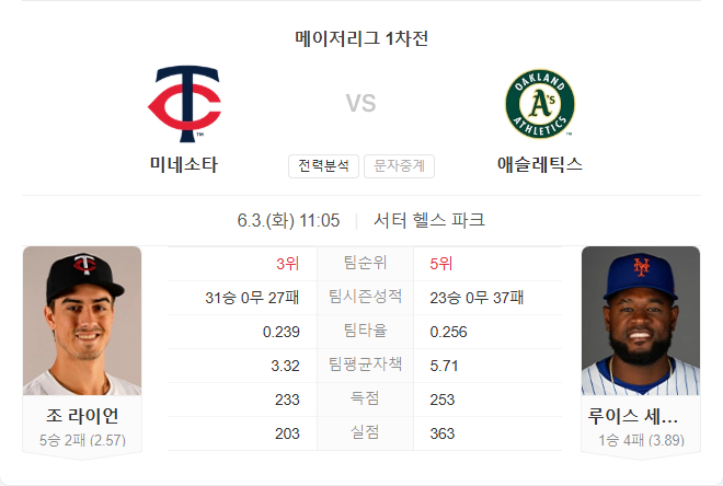 타선은 오히려 상승세를 보이고 있으며, 팀 타율 .259, 출루율 .344, 장타율 .421로 최근 16홈런을 기록하는 등 장타력도 상승 중입니다. 그러나 득점 기회를 살릴 수 있는 안정된 투수 운영이 부족해 경기 흐름을 잡지 못하고 있습니다. 선발 루이스 세베리노는 이번 시즌 평균자책 3.89로 준수하지만, 미네소타 상대로는 3경기에서 평균자책 7.71로 매우 부진한 기록을 가지고 있습니다.