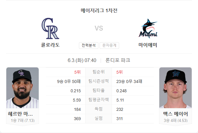 콜로라도는 현재 리그 최악의 흐름 속에서 타선과 마운드 모두가 무너진 상태입니다. 특히 원정 경기에서는 더욱 극심한 득점력 저하가 발생하고 있으며, 선발 마르케스 역시 안정감을 잃은 모습입니다. 반면 마이애미는 비록 상승세는 아니지만 홈에서 꾸준한 경기력을 유지하고 있고, 콜로라도와의 상대 전적에서도 우위를 점하고 있습니다. 마이어가 불안한 경기 운영을 보이고 있지만 콜로라도의 부진한 타선을 상대한다는 점에서 충분히 승산이 있습니다.