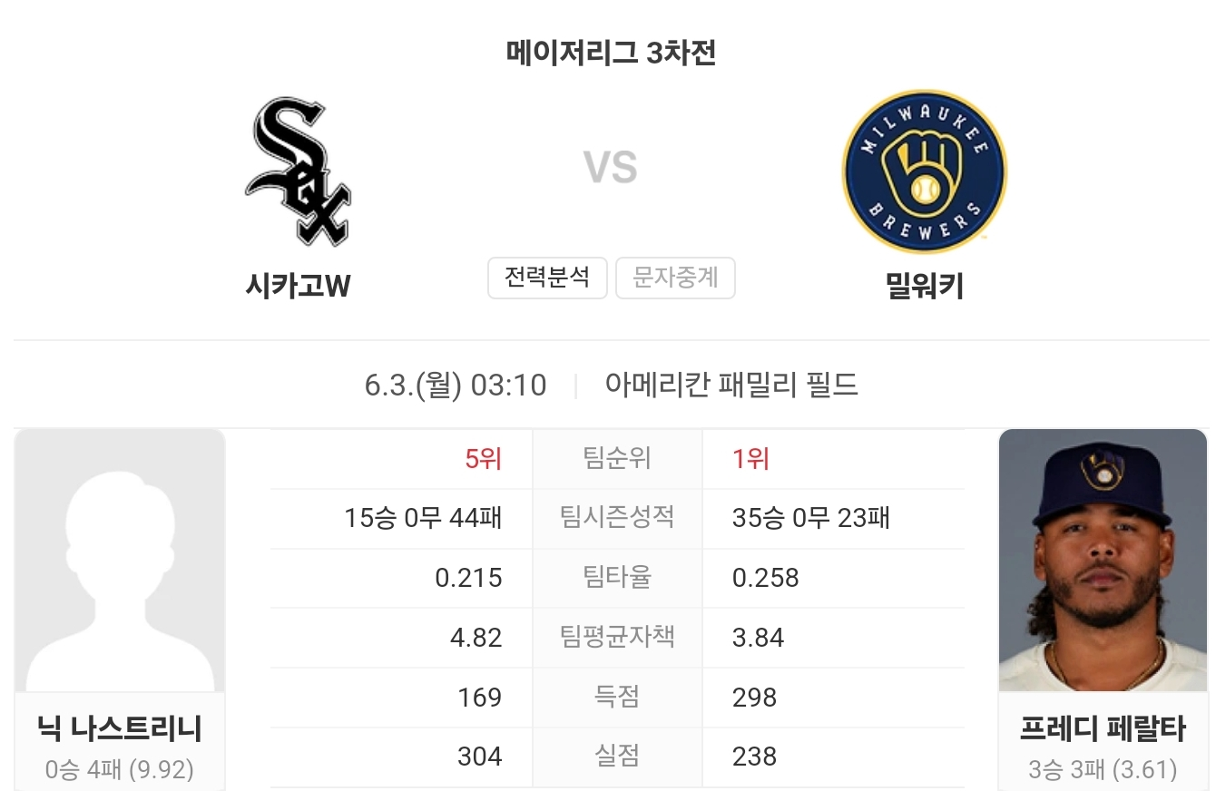 밀워키 브루어스는 최근 홈 경기 6승 중 5승을 기록하며 좋은 성적을 유지하고 있습니다. 강력한 공격력과 닉 나스트리니의 부진을 고려할 때, 브루어스가 유리한 경기입니다. 시카고 화이트삭스는 최근 경기력 저하와 투수진의 부진으로 어려움을 겪고 있어, 밀워키가 승리할 가능성이 큽니다.