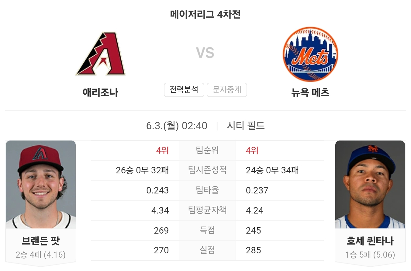 브랜든 파팃은 최근 5경기 중 4경기에서 3실점 이상을 허용한 반면, 호세 킨타나는 홈 경기에서 비교적 안정적인 투구를 보여주고 있습니다. 다이아몬드백스는 타격 면에서는 강점을 보이지만, 최근 부진한 경기력과 불펜의 약점이 발목을 잡을 가능성이 큽니다. 반면 메츠는 최근 두 경기에서 승리하며 분위기를 탔고, 킨타나의 안정적인 투구로 인해 이번 경기에서도 우위를 점할 것으로 예상됩니다.
