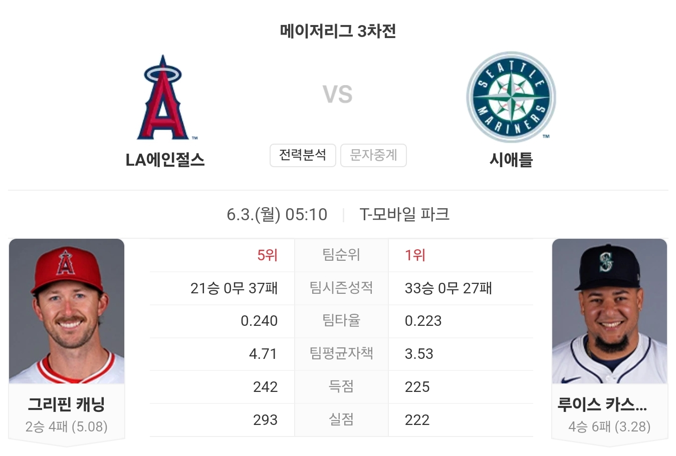 매리너스는 이번 시즌 꾸준한 성적을 유지하고 있으며, 카스티요의 안정적인 투구가 큰 힘이 되고 있습니다. 반면, 에인절스는 부상과 부진으로 어려움을 겪고 있습니다.