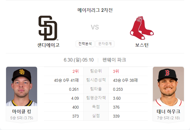 6월 30일 MLB 샌디에이고 파드리스 VS 보스턴 레드삭스 타카짱의 경기 예측 분석