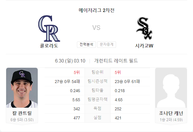 이번 경기에서는 콜로라도 로키스의 승리를 예상합니다. 콜로라도의 선발 투수 칼 퀀트릴은 이번 시즌 안정적인 모습을 보이며, 팀의 몇 안 되는 승리를 이끌어왔습니다. 반면, 시카고 화이트삭스의 조나단 캐넌은 최근 디트로이트 타이거즈를 상대로 1이닝 동안 5실점을 기록하며 불안한 모습을 보였습니다.