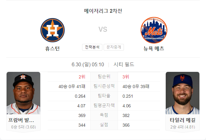뉴욕 메츠는 40승 39패로 내셔널 리그 동부 지구에서 3위를 차지하고 있습니다. 최근 4연승을 기록하며 좋은 흐름을 타고 있는 메츠는 타일러 메길이 선발 등판할 예정입니다. 메길은 이번 시즌 33.2이닝 동안 21실점을 허용하며 어려움을 겪고 있지만, 최근 경기에선 좋은 모습을 보였습니다. 피안타율 .420, 강한 타구 비율 46.6%, 예상 자책점 4.47을 기록하며 상대 타자들이 강하게 공을 맞추고 있습니다.