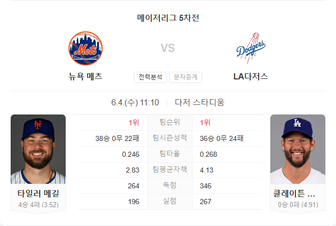 양 팀 모두 최근 상승세를 타고 있지만, 메츠는 투수진의 안정감과 최근 시리즈 연승의 기세가 강합니다. 특히 메길이 최근 2경기에서 좋은 흐름을 유지 중이며, 다저스의 불펜이 다소 불안정한 상황입니다. 커쇼는 메츠 상대로 강했지만 현재 구위는 예년만큼 압도적이지 않으며, 불펜 소모가 많은 다저스로서는 선발 이후가 변수입니다. 타선은 다저스가 우위지만, 최근의 메츠 불펜이라면 이를 제어할 가능성이 큽니다.