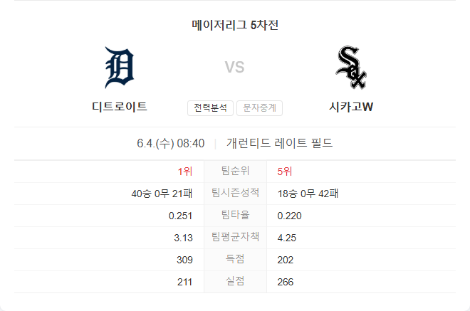 타이거스는 최근 흐름이 좋고, 깁슨-롱이 안정적인 제구와 경험을 바탕으로 무난한 복귀전을 펼칠 가능성이 높습니다. 화이트삭스는 스미스의 호투에도 불구하고 득점 지원이 부족하며, 팀 전체 흐름에서 상승 동력을 찾지 못하고 있습니다. 전력 균형과 분위기 면에서 디트로이트가 유리한 경기를 펼칠 전망입니다.