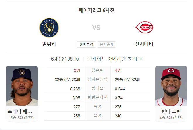 6월 4일 MLB 메이저리그 밀워키 브루어스 VS 신시내티 레즈 타카짱의 경기 예측 분석
