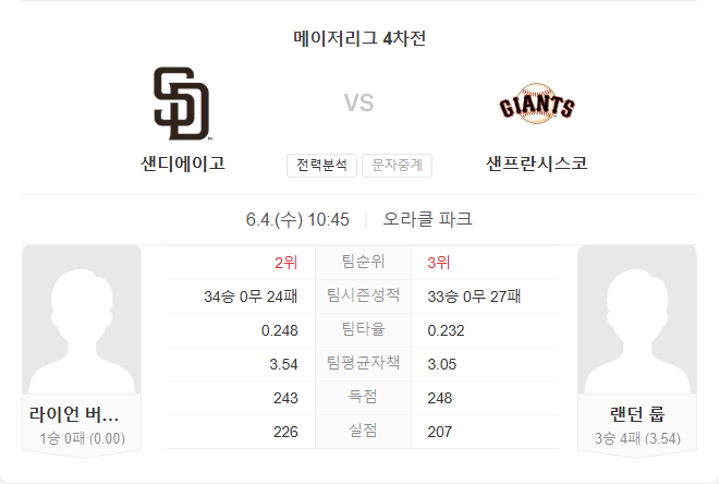6월 4일 MLB 메이저리그 샌디에이고 파드리스 VS 샌프란시스코 자이언츠 타카짱의 경기 예측 분석