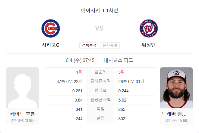 컵스는 선발 호튼의 상승세와 전체적인 팀 밸런스에서 워싱턴을 앞서고 있습니다. 내셔널스는 타선 흐름이 나쁘지 않지만, 윌리엄스의 불안한 홈 성적이 변수로 작용할 가능성이 큽니다. 컵스는 원정에서도 안정적인 경기 운영이 가능하며, 불펜도 더 신뢰할 수 있는 전력을 갖추고 있어 우세한 전개가 예상됩니다.