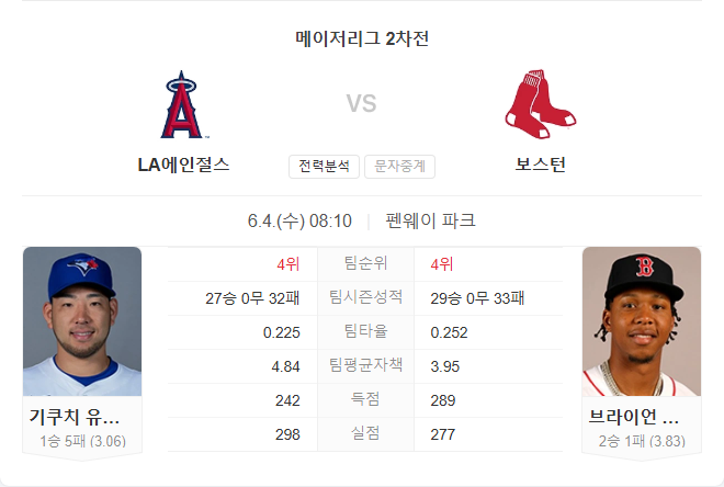 양 팀 모두 부상 이탈자가 많은 가운데, 보스턴은 타선에서 넓은 뎁스를 바탕으로 어느 정도의 공격력을 유지하고 있습니다. 반면 에인절스는 장타력 외에는 타격 효율성이 떨어지며, 마운드 전반의 불안정함도 부담입니다. 키쿠치가 좋은 페이스를 유지하고 있지만, 보스턴 타선이 초반부터 공략에 성공한다면 홈에서 충분히 흐름을 가져올 수 있습니다. 벨로 역시 다소 불안한 요소가 있지만, 상대보다 더 나은 지원을 받을 수 있는 상황입니다.