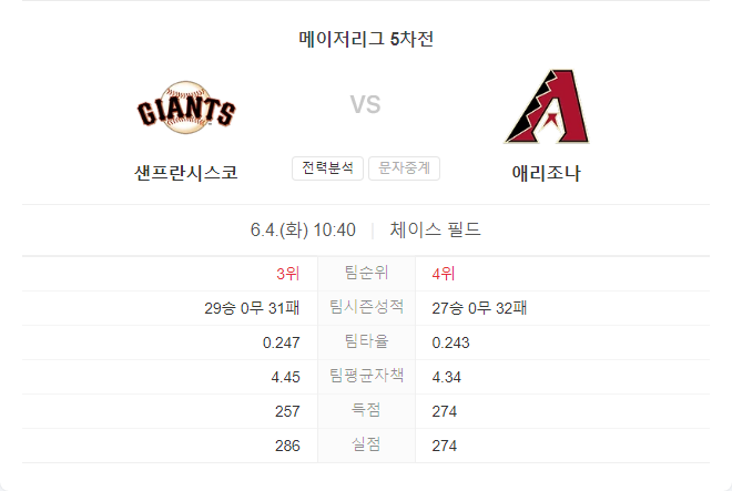 6월 4일 MLB 샌프란시스코 자이언츠 VS 애리조나 다이아몬드백스 타카짱의 경기 예측 분석