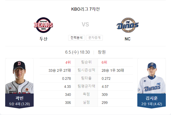 6월 5일 KBO 프로야구 두산 베어스 VS NC 다이노스 타카짱의 경기 예측 분석