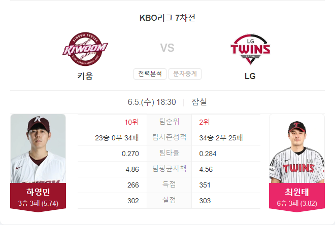 이번 경기에서는 키움의 선발 투수 하영민의 부진이 계속될 가능성이 높아 보입니다. LG의 최원태는 안정적인 투구로 팀의 승리를 이끌 것으로 예상됩니다. 또한, LG의 타선은 최근 높은 타격 능력을 보여주고 있어 키움의 투수진을 공략할 가능성이 큽니다. 따라서, 이번 경기는 LG 트윈스의 승리가 예상됩니다.
