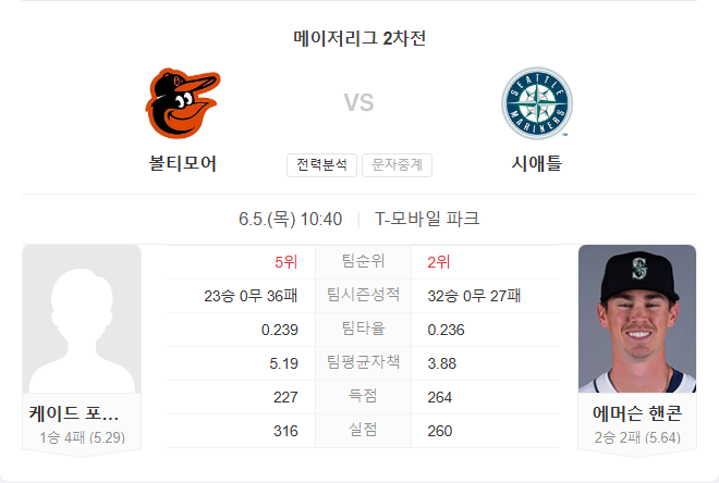 양 팀 선발 모두 불안한 성적을 기록 중이지만, 타선의 흐름에서 큰 차이가 납니다. 시애틀은 최근 여러 타자들이 고른 활약을 이어가며 경기당 꾸준한 득점을 기록하고 있으며, 홈경기에서 특히 강한 모습을 보이고 있습니다. 반면 볼티모어는 포비치가 실점을 막기 어려운 구성이고, 타선 역시 상위 몇 명을 제외하면 믿을 수 없는 수준입니다. 시애틀이 경기 중반 이후 리드를 잡고 승리할 가능성이 높습니다.