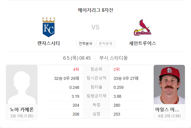 6월 5일 MLB 메이저리그 캔자스시티 로열스 VS 세인트루이스 카디널스 타카짱의 경기 예측 분석