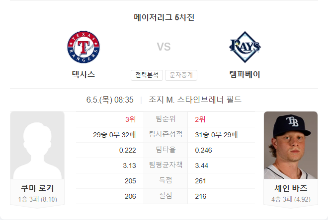 6월 5일 MLB 메이저리그 텍사스 레인저스 VS 탬파베이 레이스 타카짱의 경기 예측 분석