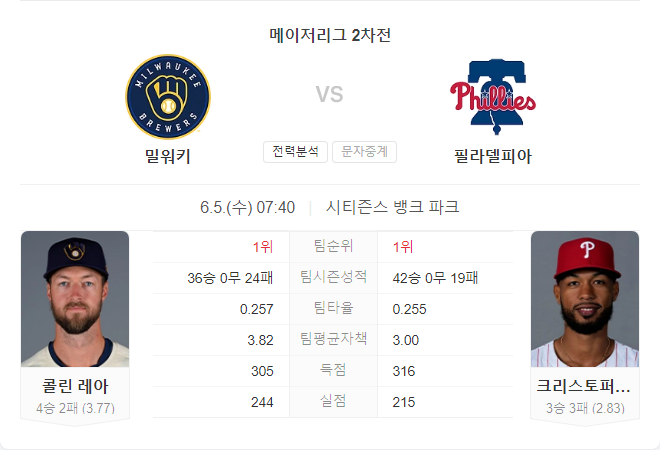 양 팀 모두 강력한 타선을 보유하고 있어 높은 득점 경기가 예상됩니다. 필리스는 홈에서 강한 모습을 보이고 있어 이번 경기도 필리스가 우세할 것으로 보입니다.