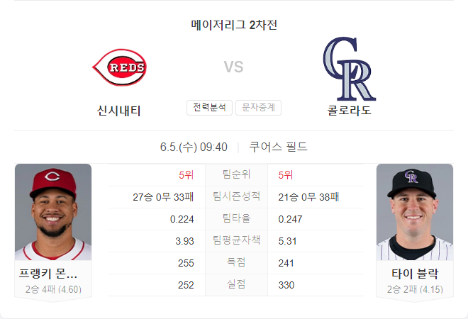 신시내티의 선발 투수 프랭키 몬타스는 최근 4경기에서 3점 이상의 자책점을 허용하며 불안정한 모습을 보였고, 콜로라도의 타이 블락은 최근 2경기에서 안정적인 투구를 이어가고 있습니다.