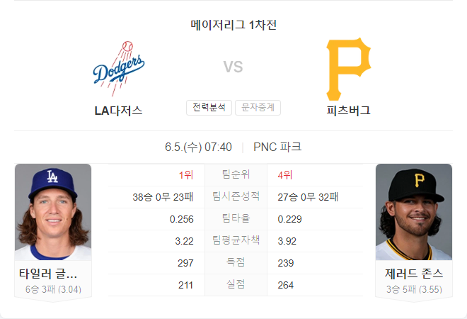 6월 5일 MLB LA 다저스 VS 피츠버그 파이어리츠 타카짱의 경기 예측 분석