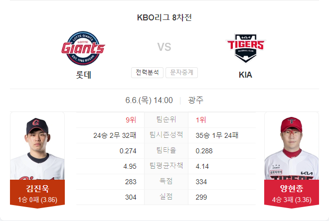 이번 시즌 KIA는 롯데를 만나면 경기력이 떨어지는 경향이 있습니다. 특히 좌타 라인의 부진이 심각합니다. 김진욱을 공략하기 쉽지 않겠지만, 양현종은 낮 경기에서 강점을 보이며 시리즈 최종전에서 강한 투수입니다.