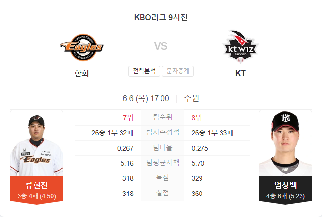 6월 6일 KBO 프로야구 한화 이글스 VS KT 위즈 타카짱의 경기 예측 분석