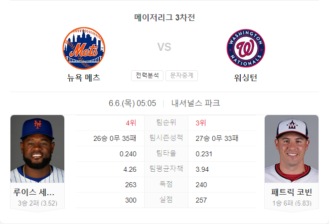 뉴욕 메츠는 최근 두 경기에서 워싱턴 내셔널스를 상대로 승리하며 상승세를 타고 있습니다. 세베리노의 안정적인 투구와 알론소의 타격이 큰 힘이 되고 있습니다. 반면, 워싱턴 내셔널스는 코빈의 부진과 팀 전체적인 성적 부진으로 어려움을 겪고 있습니다. 이러한 점을 고려할 때, 이번 경기는 뉴욕 메츠의 승리가 예상됩니다.