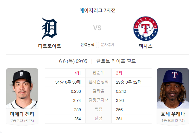 6월 6일 MLB 디트로이트 타이거즈 VS 텍사스 레인저스 타카짱의 경기 예측 분석